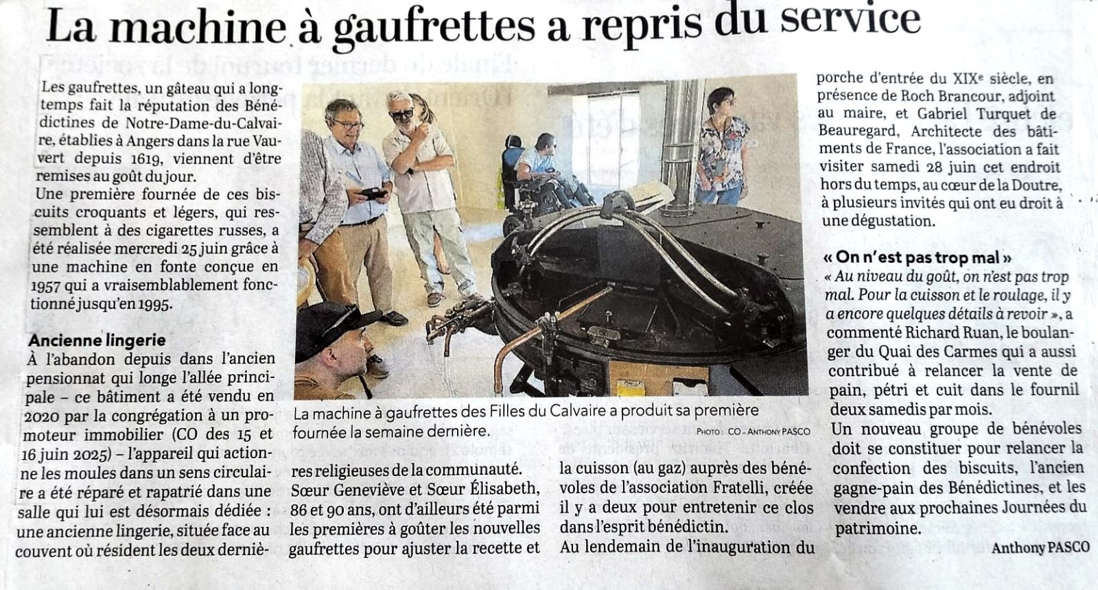 A l'issue de l'inauguration du porche les 27 et 28 juin 2025, qui a été l'occasion de faire la dégustation de la première fournée de gaufrettes après la restauration du gaufrier, un nouvel article est paru, signé d'Anthony Pasco dans le Courrier de l'Ouest.